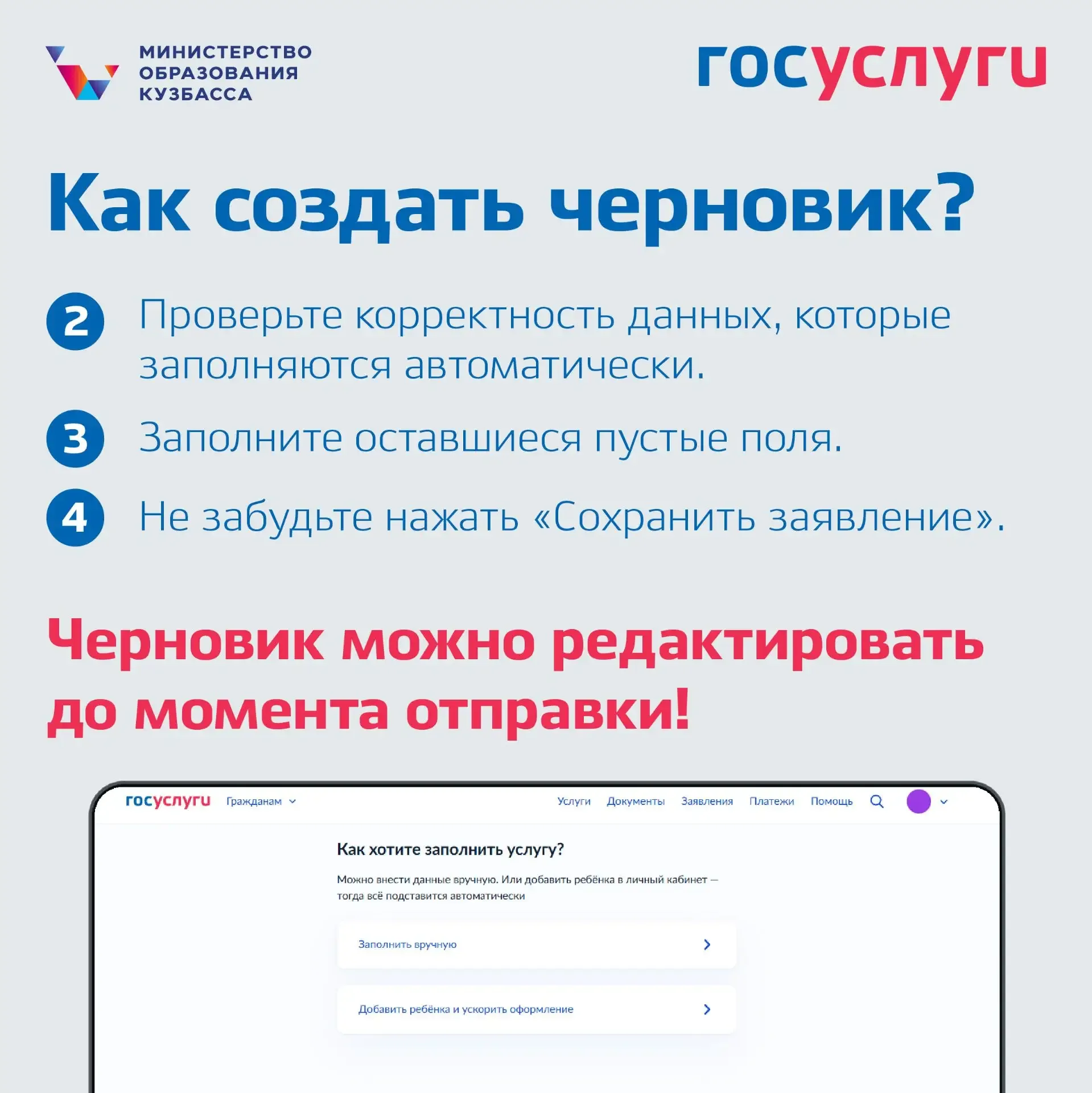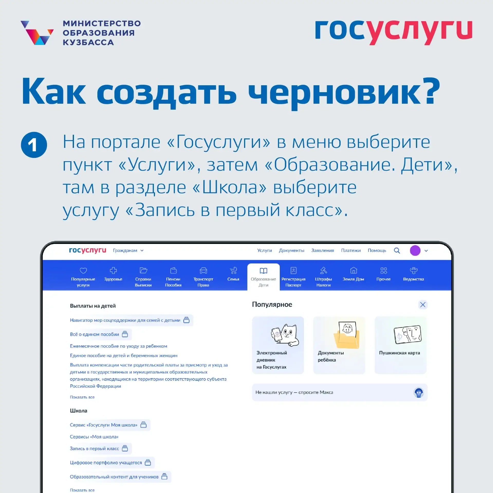 📌Уже сейчас на портале «Госуслуги» и в Электронной школе 2.0 можно оформить черновик, чтобы подать заявление сразу после открытия записи — 1 апреля.